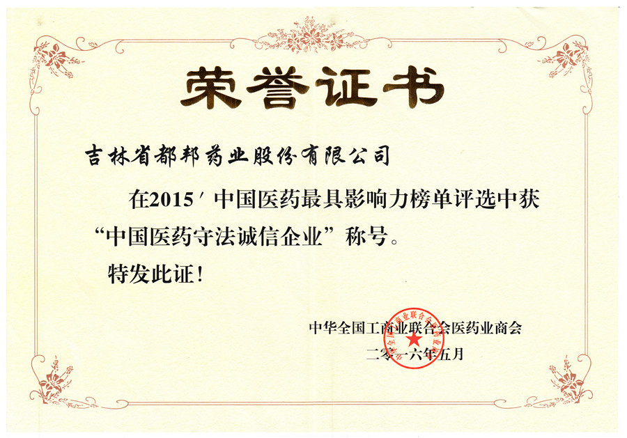中国医药最具影响力榜单评选中获“中国医药守法诚信企业”称号